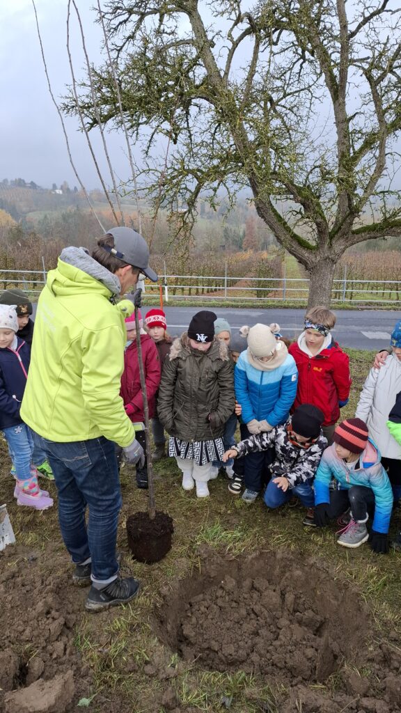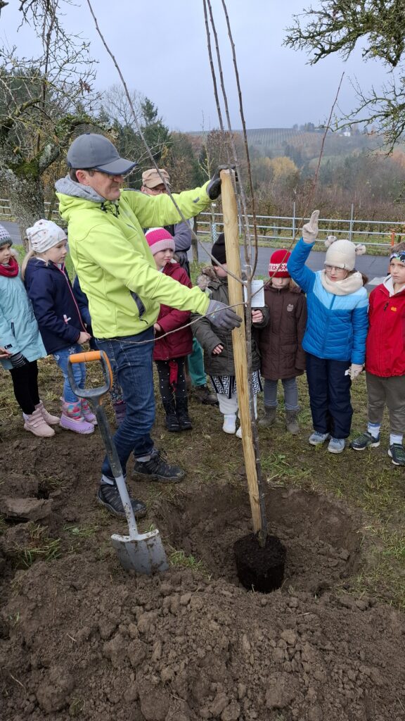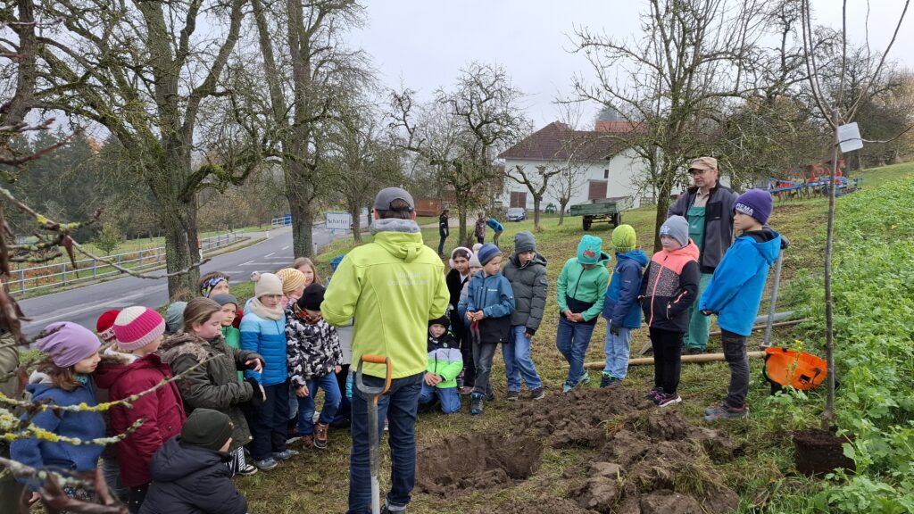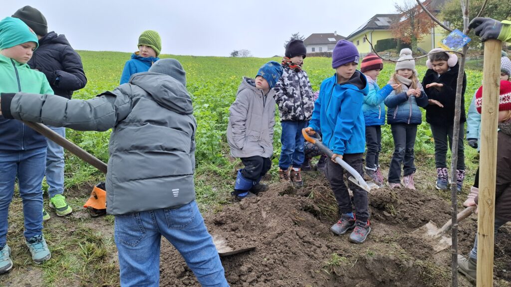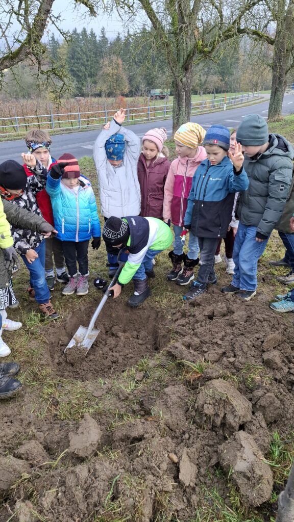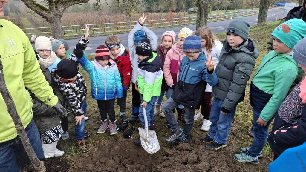 Obstbaum 13. November 2025 Gemeinsam mit Rainer Silber vom Naturpark pflanzten die Kinder der 2. Klassen einen Zwetschkenbaum.