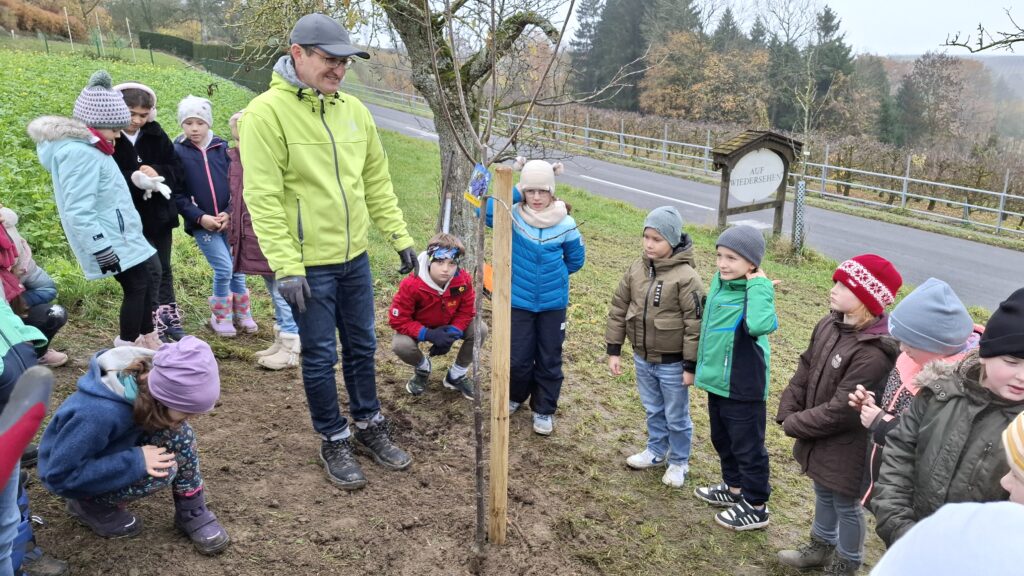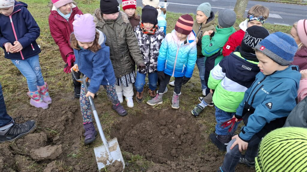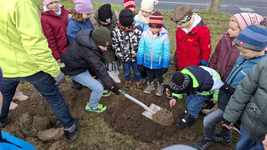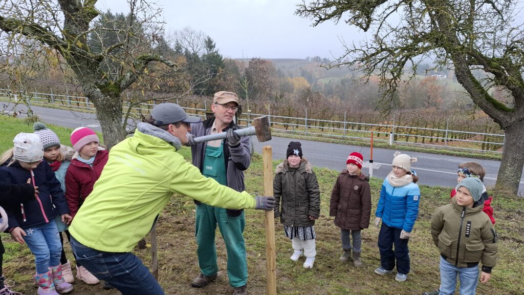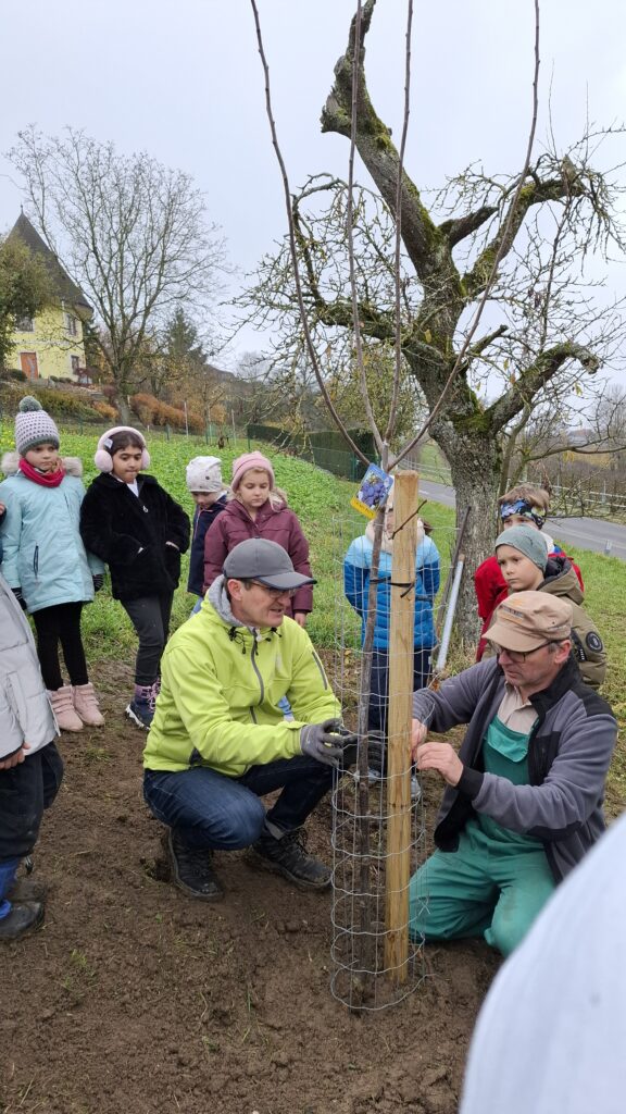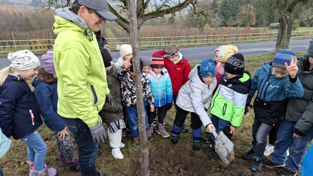 Obstbaum 13. November 2025 Gemeinsam mit Rainer Silber vom Naturpark pflanzten die Kinder der 2. Klassen einen Zwetschkenbaum.